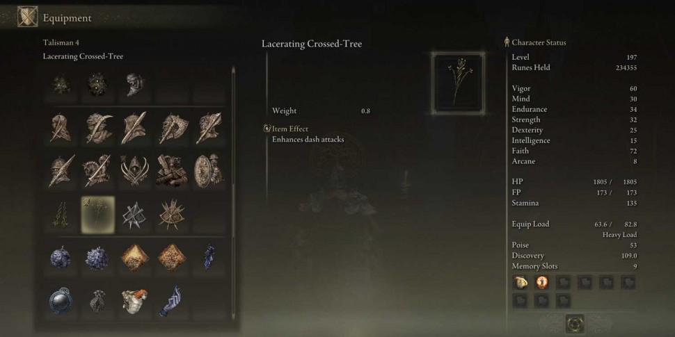 Lacerating Crossed-Tree - новый талисман в Shadow of the Erdtree, который усиливает атаки, выполняемые после рывка. Вес талисмана Lacerating Crossed-Tree составляет 0,3.