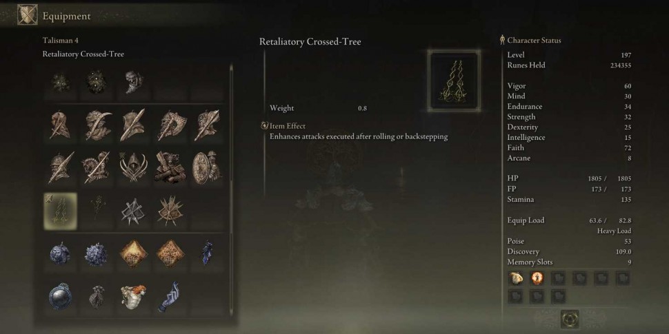 Retaliating Crossed-Tree - новый талисман в Shadow of the Erdtree, который увеличивает урон от атак после отступления или переката. Вес талисмана Retaliating Crossed-Tree составляет 0,3.