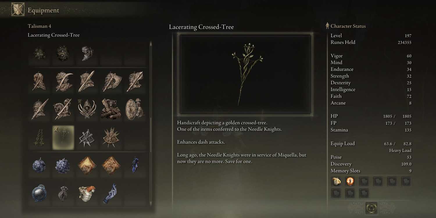 Lacerating Crossed-Tree - новый талисман в Shadow of the Erdtree, который усиливает атаки, выполняемые после рывка. Вес талисмана Lacerating Crossed-Tree составляет 0,3.