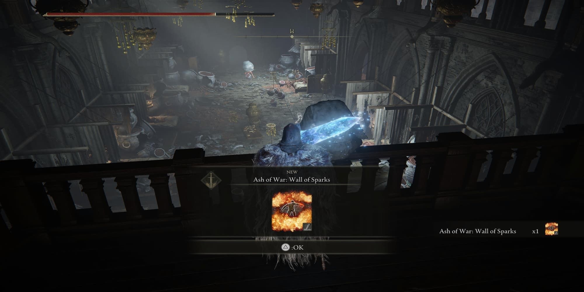 В следующей комнате поверните направо и медленно идите по следующему коридору. С левой стороны на вас выпрыгнет враг в виде кувшина, который взорвет свой кувшин, и с ним нужно будет сразиться. Выйдите из коридора налево через дверной проем, из которого появился враг-джар, и обнаружите тело, сидящее на перилах, с Пепел войны: Стена искр можно найти на нем.