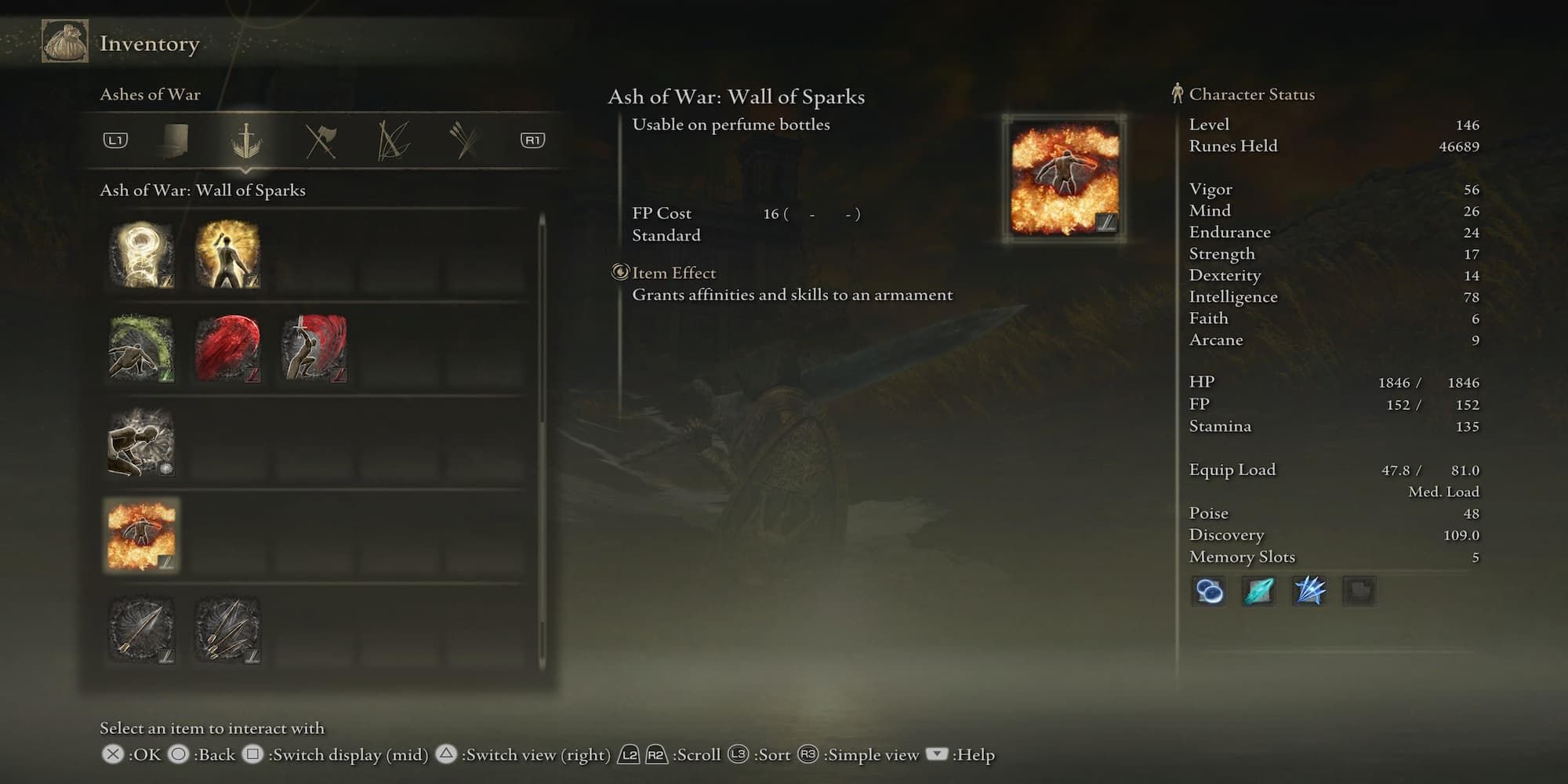 Парфюмерные бутылочки - это уникальный способ дать возможность различным билдам разветвиться и использовать элементальный урон без необходимости применять заклинания. Парфюмерные бутылки лучше всего подходят для билдов, обладающих ловкостью, и предлагают различные элементы в зависимости от типа используемой парфюмерной бутылки. Пепел войны: Стена искр можно экипировать на парфюмерную бутылочку, чтобы получить навык "Стена искр".