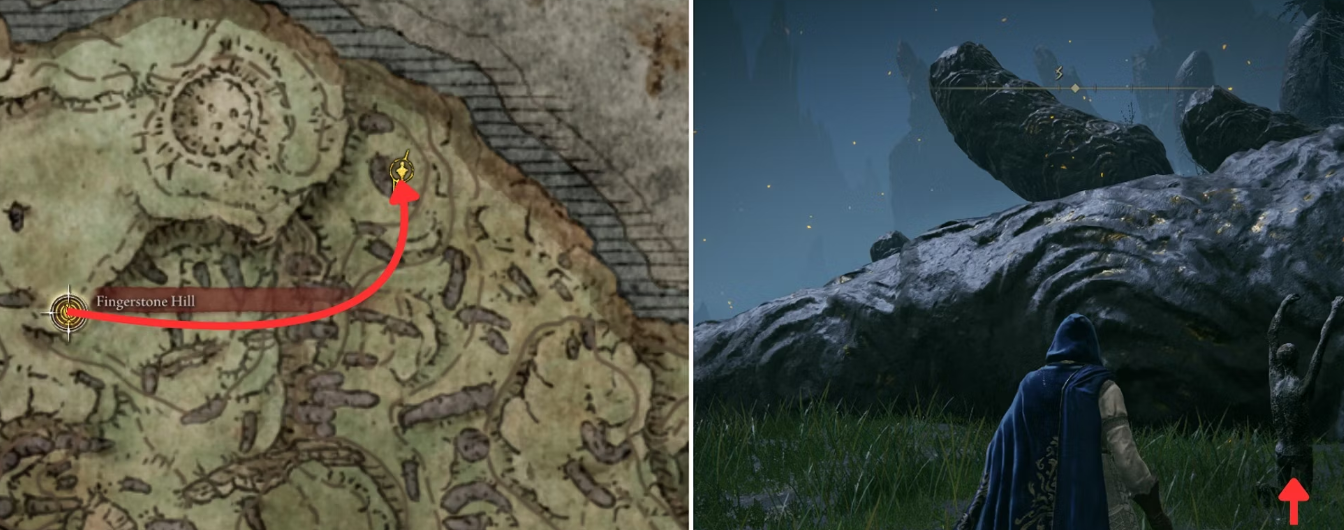 Чтобы найти жест "Два пальца", вам нужно попасть в Хинтерлендс, куда можно попасть после использования жеста "О Матерь". Затем вы должны открыть место Благодати в Хинтерлендах и отправиться на восток, в Руины пальцев Дхео. Проехав немного мимо Пальцеглазов, поверните на север и доберитесь до конца скалы.