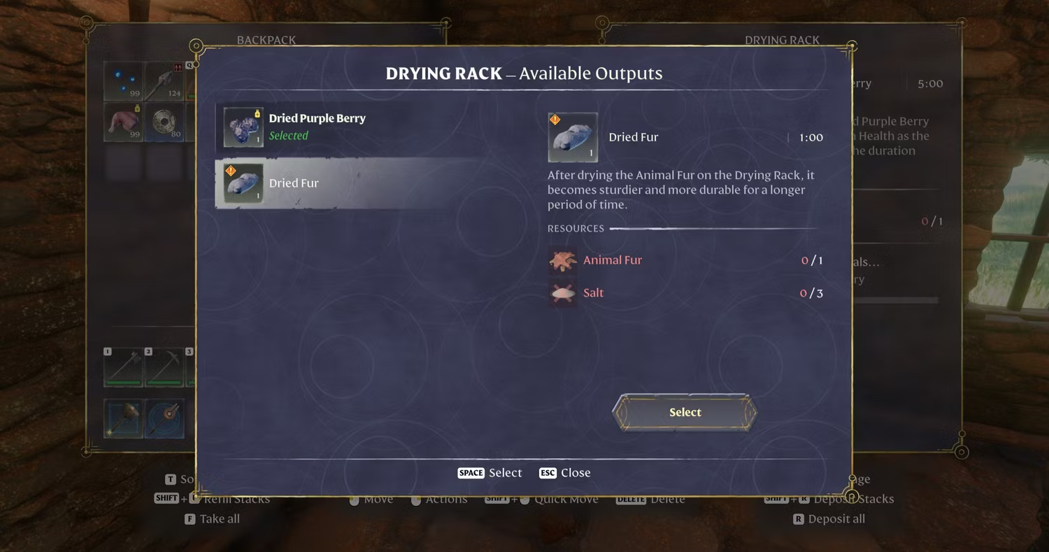 Когда вы выполните ее квест и будете знать, где взять соль, бросьте ее в сушильную стойку и начните производить сушеный мех. Это позволит изготовить следующие апгрейды рюкзака:
