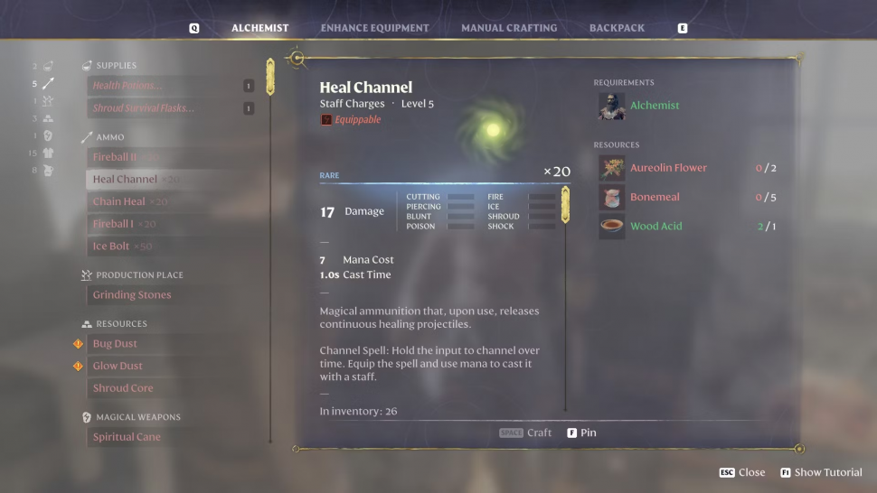 Древесная кислота используется в нескольких предметах ремесла, связанных с алхимией. Например, чтобы изготовить заряд для посоха "Канал исцеления", вам понадобятся следующие материалы.