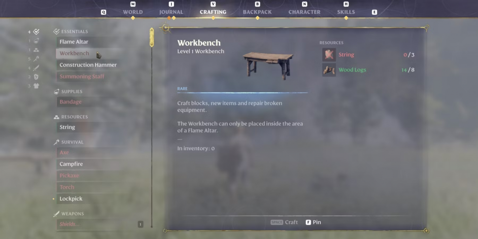 Хотя стартовые инструменты будут не слишком эффективными, игрокам не нужно тратить ресурсы на постоянное создание новых только потому, что они могут сломаться. Вместо этого загляните в меню ремесел и обратите внимание на верстак, который можно построить на базе. Для этого потребуется 3 струны и 8 древесных бревен.