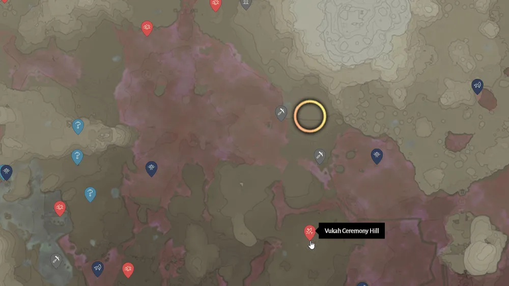 Начнем с шахтерского лагеря! К северу от холма Вука Церемония вы найдете узлы добычи кремня и соли. Расположите базу между этими двумя местами добычи (как показано ниже) - это отличный способ повысить эффективность добычи.