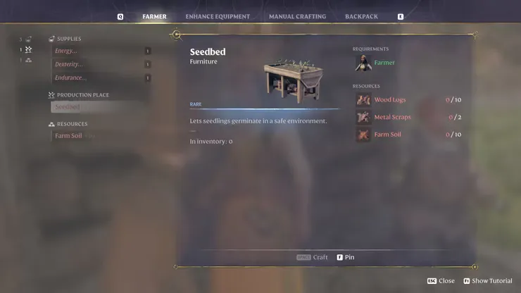 Обязательно создайте убежище для Фермерши, чтобы она могла предоставить вам все доступные рецепты ремесел, и вы сможете начать заниматься сельским хозяйством. Вам нужно будет создать грядку, фермерскую почву и саженцы, чтобы иметь возможность выращивать свои собственные продукты.