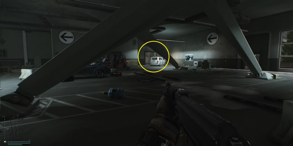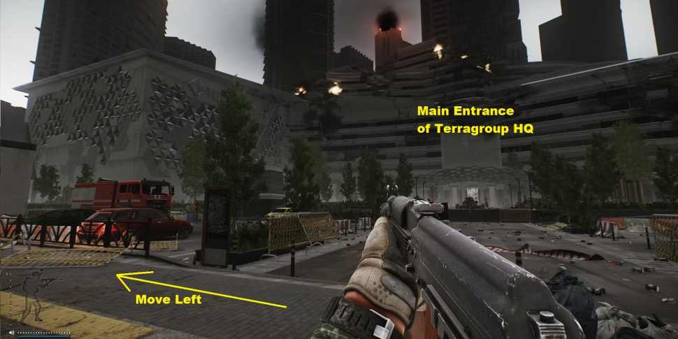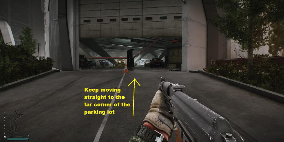 Вы можете отправиться на стоянку и из внутренней части штаб-квартиры Terragroup, но это может быть немного сложно, особенно если вы не спаунитесь внутри здания. При этом мы настоятельно рекомендуем вам бежать по улице так быстро, как только можете, потому что, двигаясь к парковке, вы просто повернетесь спиной к пулемету на здании позади. Скавсы никогда не используют пулемет, но если игрок доберется до него в самом начале игры, вам будет трудно перейти улицу.