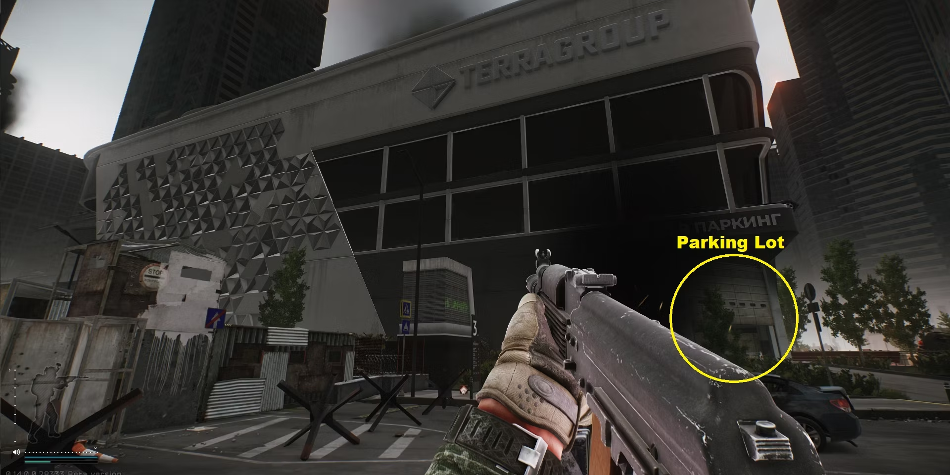 Вы можете отправиться на стоянку и из внутренней части штаб-квартиры Terragroup, но это может быть немного сложно, особенно если вы не спаунитесь внутри здания. При этом мы настоятельно рекомендуем вам бежать по улице так быстро, как только можете, потому что, двигаясь к парковке, вы просто повернетесь спиной к пулемету на здании позади. Скавсы никогда не используют пулемет, но если игрок доберется до него в самом начале игры, вам будет трудно перейти улицу.
