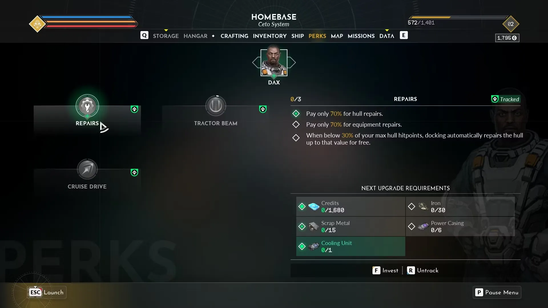 После этого игроки могут приобретать перки у разблокированных персонажей, выполняя их запрос на ресурсы для этого перка. Эти навыки могут иметь различные эффекты, например, снижать стоимость модернизации или увеличивать дальность действия тягового луча, что может оказаться очень полезным при навигации в космосе.
