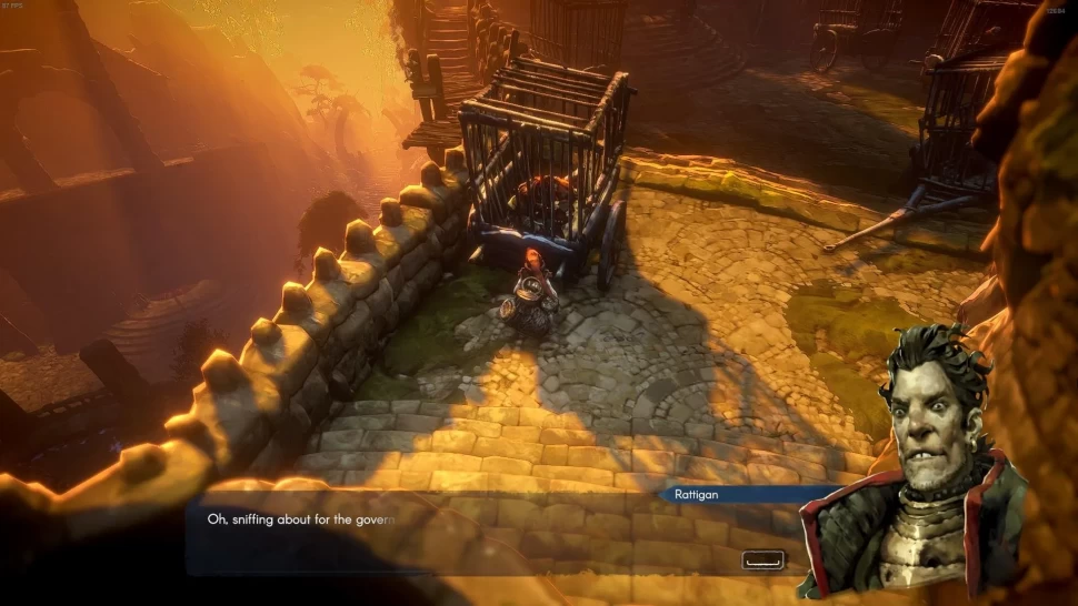 Если вы пройдете к башне на южной стороне Раттигана, то обнаружите двух охранников, которые разговаривают друг с другом, а подслушав, вы узнаете, что третий охранник по имени Жерар недавно напился и пошел окунуться с головой в фонтан. Это ваша подсказка для поиска ключа к клетке Раттигана, и вы легко узнаете об этом по оранжевому тексту диалога.