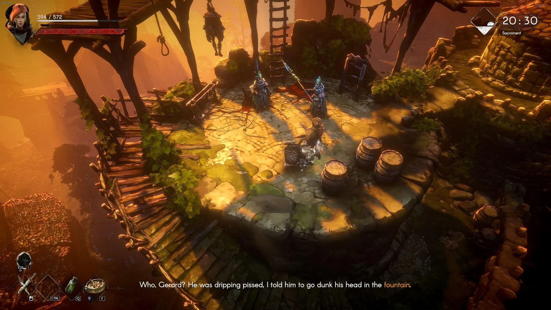 Если вы пройдете к башне на южной стороне Раттигана, то обнаружите двух охранников, которые разговаривают друг с другом, а подслушав, вы узнаете, что третий охранник по имени Жерар недавно напился и пошел окунуться с головой в фонтан. Это ваша подсказка для поиска ключа к клетке Раттигана, и вы легко узнаете об этом по оранжевому тексту диалога.
