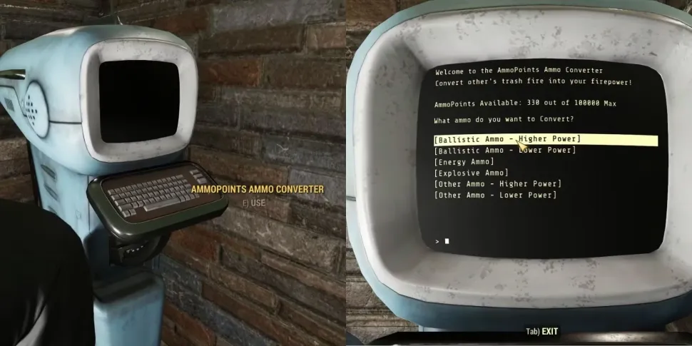 В Fallout 76 конвертер патронов - это полезный инструмент для обмена патронов. Он превращает ненужные патроны игроков в баллы AmmoPoints, которые они могут использовать для покупки четырех типов патронов: Баллистические, энергетические, взрывчатые и другие.