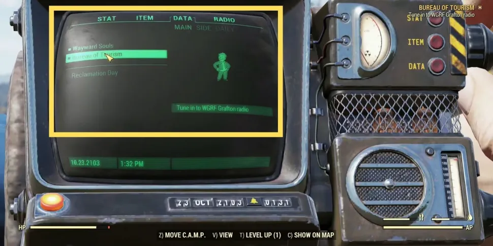Pip-Boy показывает текущие основные и побочные задания. Игрокам достаточно нажать кнопку B ("Круг" на PlayStation), чтобы открыть Pip-Boy, затем открыть вкладку "Данные" и прокрутить до главного или побочного меню. Нажатие на задания в этих разделах удаляет их из HUD игры. Однако это не означает, что они были заброшены.