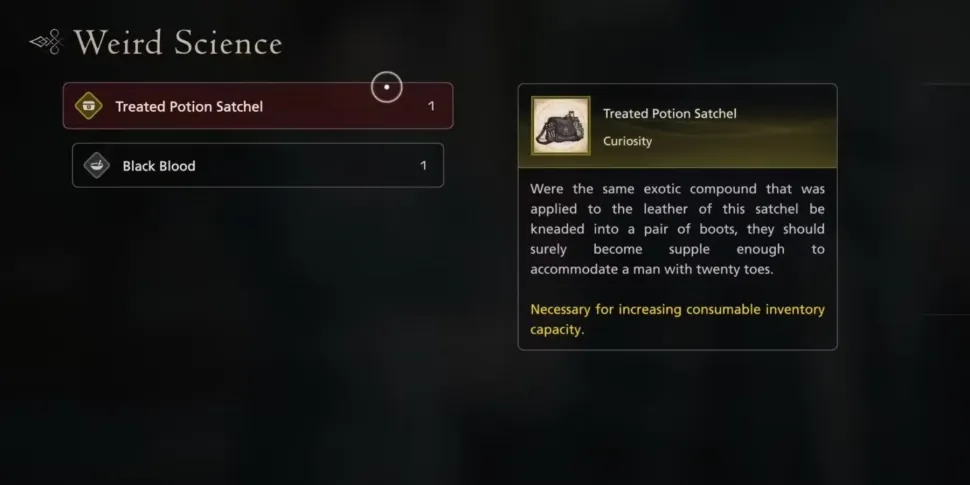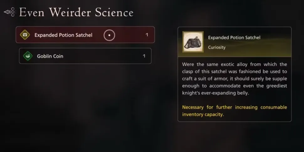 Приобретение Treated Potion Satchel может существенно изменить ситуацию для игроков, у которых регулярно заканчиваются предметы, но тем, кто хочет иметь при себе еще больше вещей, стоит приобрести Expanded Potion Satchel. Клайв получит этот предмет после завершения "Еще более странной науки" - побочного задания, которое становится доступным во время "Across the Narrow", шестьдесят второго основного задания в Final Fantasy 16.