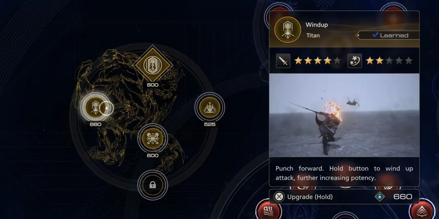 Windup позволяет Клайву призвать кулак Титана и зарядить его мощным ударом. Чем дольше игрок заряжает эту атаку, тем больше урона и отдачи она наносит. Если игрок отпустит атаку, пока маркер находится в красной зоне, она нанесет еще больше урона. Это движение наносит невероятный урон, оцениваемый в 4 звезды за силу атаки, и его несложно правильно выбрать для точной атаки.