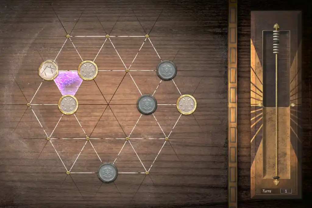 У атакующих есть четыре монеты, а у защитников - только три. Монетки движутся по линейным траекториям, и большинство из них может перемещаться только на одно место за раз. Чтобы переместить монету, выберите ту, которую вы хотите переместить, а затем выберите свободное место для ее перемещения. Доски бывают разных форм и размеров, поэтому пути, по которым вы можете перемещать свои монеты, будут меняться от соперника к сопернику.