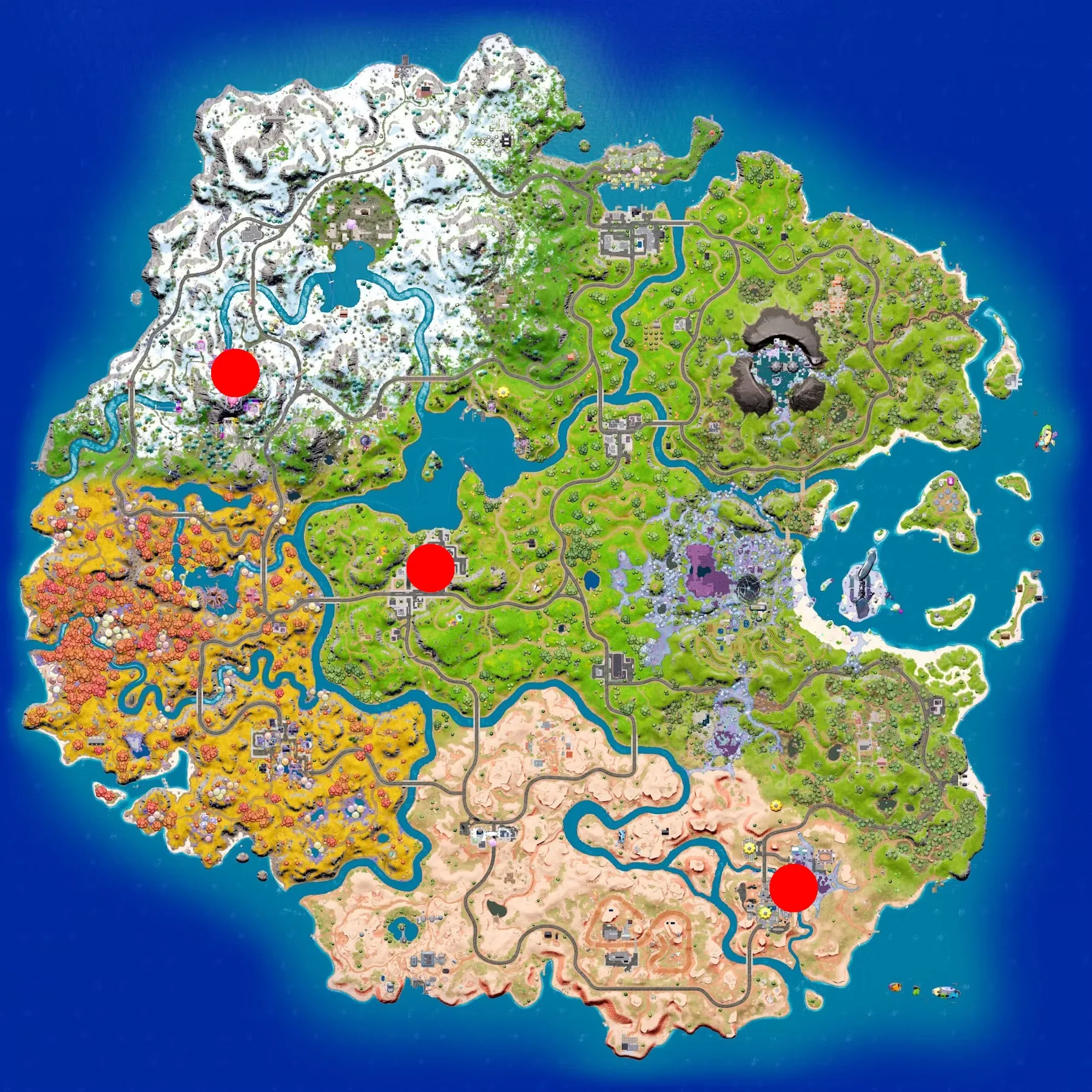 Dial-A-Drop имеет шанс появиться в сундуках и в качестве напольного лута, поэтому игрокам, которые ищут его, рекомендуется искать в местах с высокой плотностью этих источников лута. На момент написания этой статьи, то есть во время 4-го сезона 3-й главы Fortnite, под это описание подходят пещера Рейв, наклонные башни и облачные кондоминиумы, которые отмечены на карте, приведенной ниже. Однако фанатам не нужно ограничивать свои поиски этими тремя местами, так как Dial-A-Drop можно получить на всей карте.