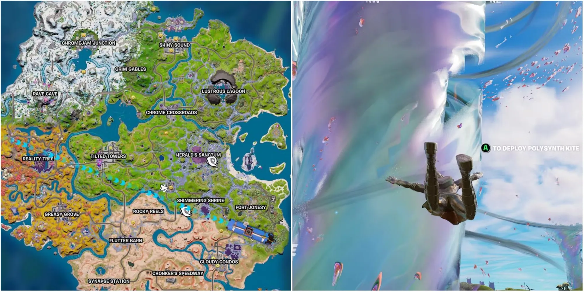 На карте есть два Chrome Vortexes, которые порождаются. Один всегда появляется в Святилище герольда, а другой постоянно перемещается. Вихрь, который постоянно перемещается, обычно появляется между Rocky Reels и Shimmering Shrine или между Shiny Sound и Lustrous Lagoon. Игроки могут открыть свою карту, как только они окажутся в Боевом автобусе, чтобы проверить, где возник этот торнадо - это белый закрученный символ, который выглядит точно так же, как символ в Святилище Геральда.