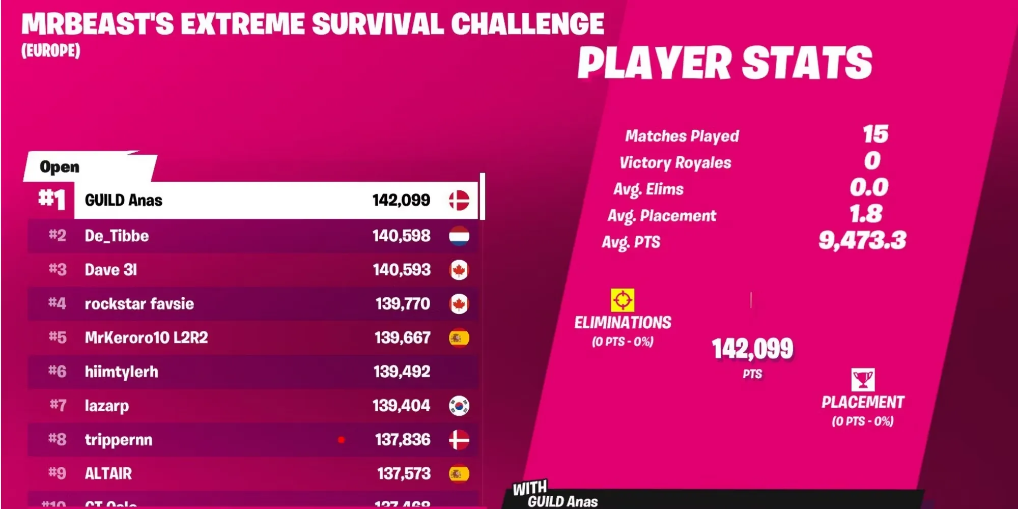 Победителем конкурса MrBeast's Extreme Survival Challenge стал GUILD Anas, профессиональный игрок в Fortnite из Guild eSports. Anas даже рассказал о своей победе на своей странице в Twitter, но это не первое соревнование по Fortnite, которое выиграл Anas. Для тех, кому интересно посмотреть стрим победы, он доступен на Twitch-канале Анаса, AnasEU. Он заканчивает свой последний матч и получает сообщение о своей победе примерно на 26-й минуте.