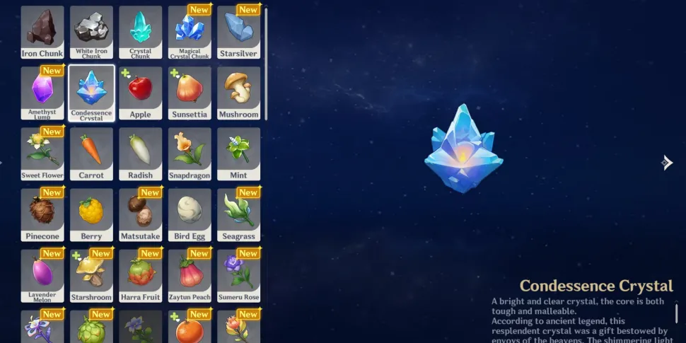 Издавна считалось, что конденсирующиеся кристаллы - это небесные дары, преподнесенные человечеству в результате Genshin Impact. Камни будут ярко мерцать днем и ночью, напоминая о благосклонности белой луны. Ремесленники тоже не остались равнодушными к прочному и податливому ядру, создавая из него аксессуары и оружие.