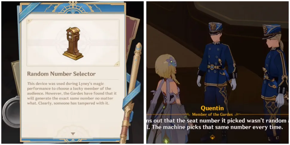 Гарды рассказывают, что устройство выбора случайных чисел, которое Лини использовал для выбора счастливого зрителя, было настроено так, что всегда попадало на одно и то же число. Поскольку известно, какое место кому принадлежит, эта подсказка вызывает подозрения в отношении пользователя 5-звездочного лука в Genshin Impact, что заставляет поверить, что в преступлении виновен Лини.