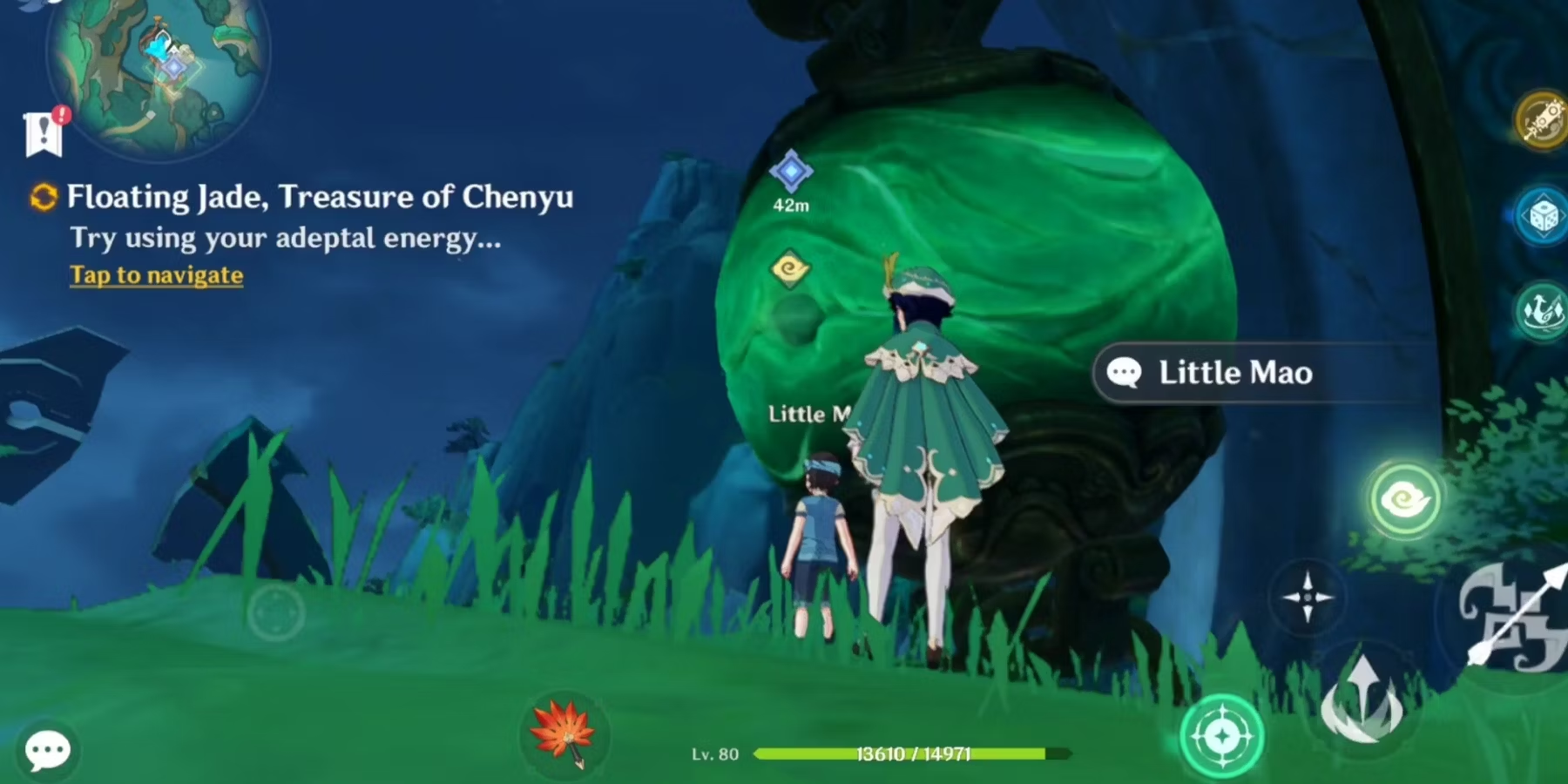 Теперь вернитесь в Джадемут, и Маленький Мао предложит использовать адептскую энергию игроков, чтобы активировать секретный водоворот. Встаньте на место рядом с ребенком, затем поднимите взгляд к зеленому нефритовому шару, чтобы увидеть маркер адептской энергии. Активируйте свою адептскую энергию, и начнется сцена, в которой будет показан водоворот, в который вы можете войти. Под ним вы найдете совершенно новую область для исследования. Здесь же путешественники снова встретят Фуджина, и адепт попросит их найти немного Рассеянной энергии адептов.