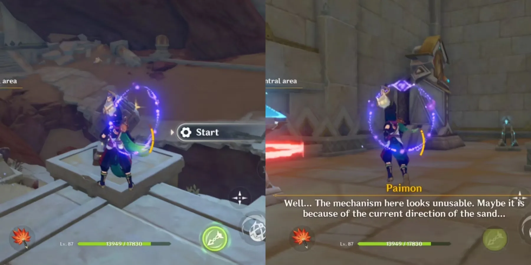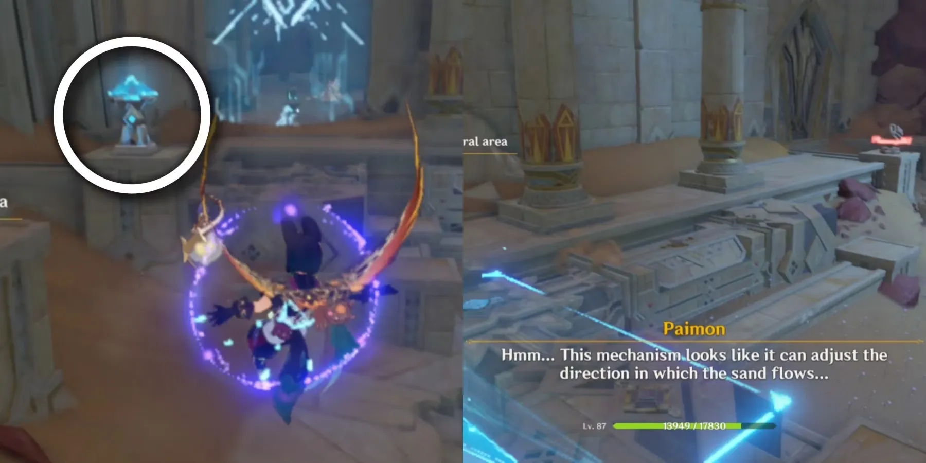 Оказавшись внутри, Паймон сделает замечание о том, что находящиеся там механизмы непригодны для использования и что игрокам следует изменить направление движения песка.