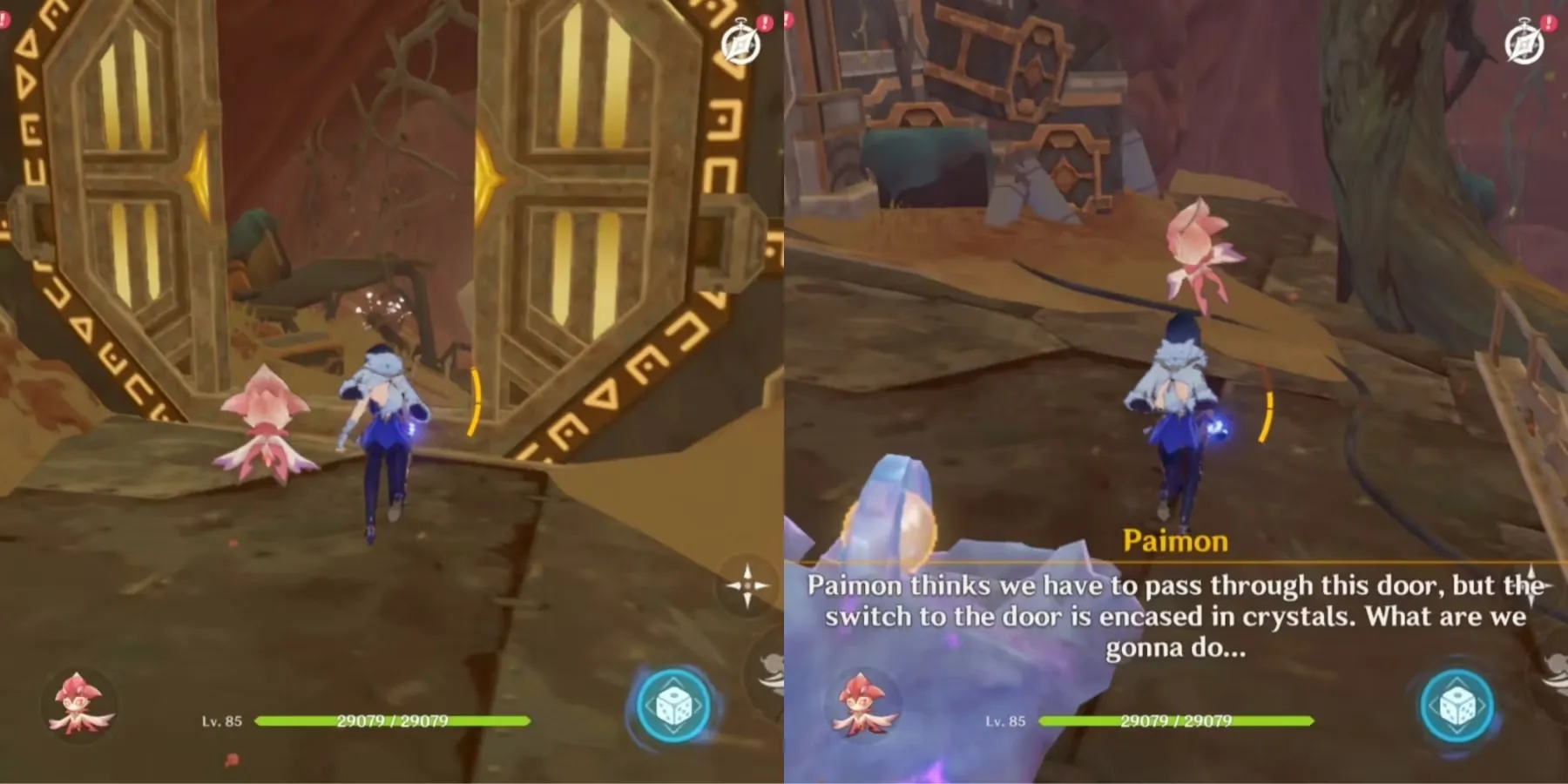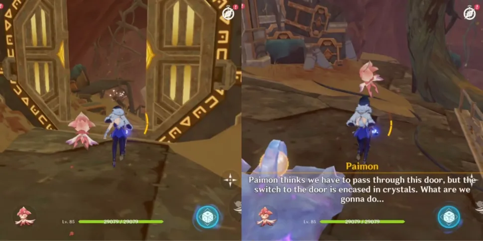 Пройдите через дверь, и она закроется, как только игроки войдут, на что укажет замечание Paimon.