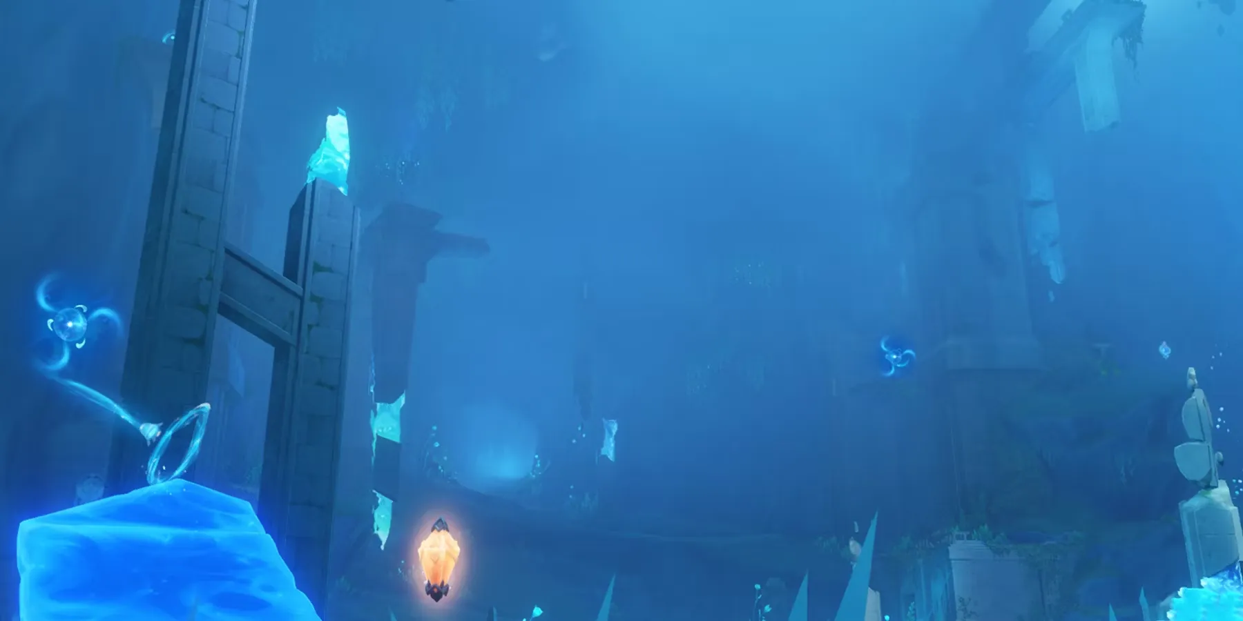 Оттуда появится еще один гидропортал, который приведет игрока к последнему набору кристаллов. Чтобы найти первый из них, идите на юг и атакуйте его, чтобы обнаружить несколько сконденсированных водных пластов, которые выглядят как открытый куб. Следуйте в этом направлении и атакуйте второй кристалл, чтобы вызвать пару платформ. Заберитесь на них, чтобы найти еще кристаллы, которые вызовут еще больше левитирующих платформ, и продолжайте атаковать и забираться на них.