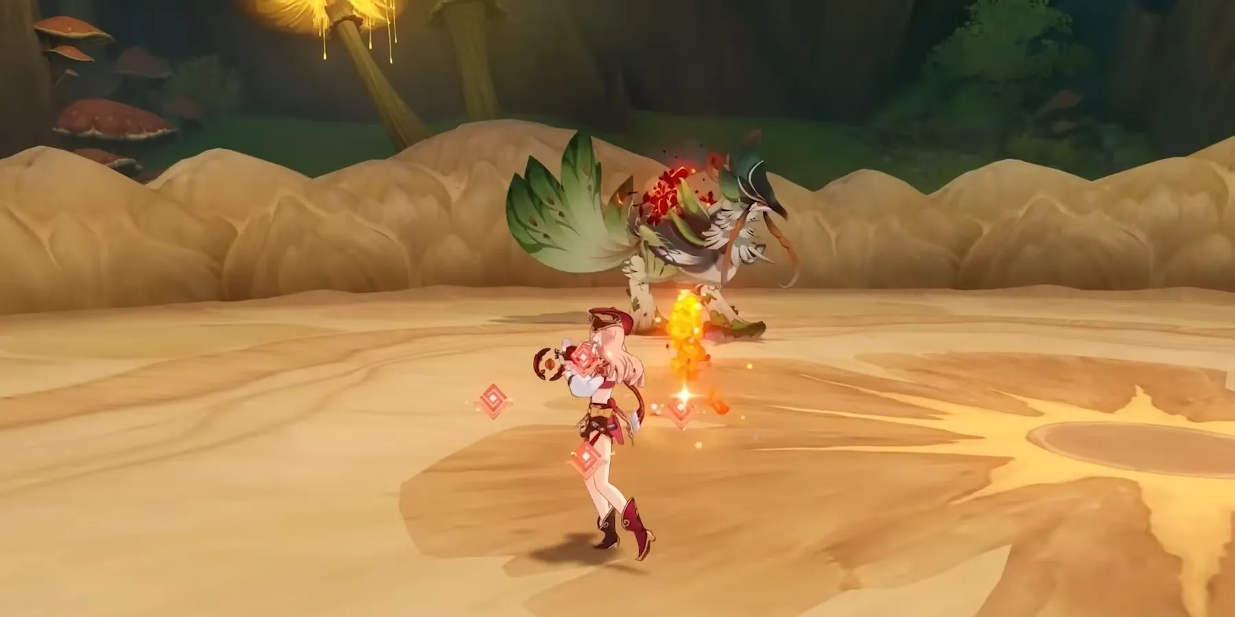 - Опаленное состояние: Босс не будет атаковать, а вместо этого вызовет несколько опаленных плавучих грибов дендро. У игроков будет много места для атаки Jadeplume Terrorshroom, когда он вызывает своих приспешников.