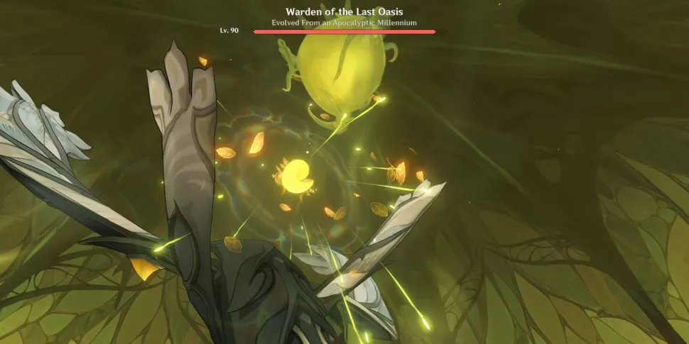 Еженедельный бой боссов начинается с фазы Warden Of The Last Oasis в Genshin Impact. Это Хранитель оазиса Апепа в ослабленном состоянии, и игроки могут заметить это по тому, насколько слабы атаки босса и как много урона он получает.