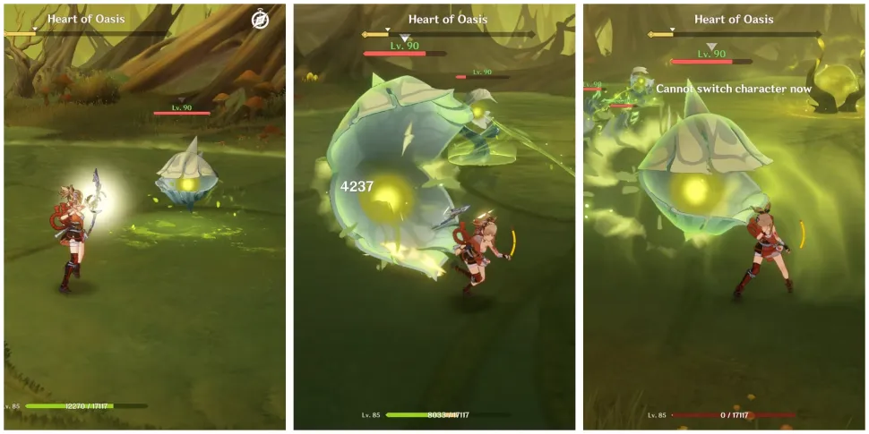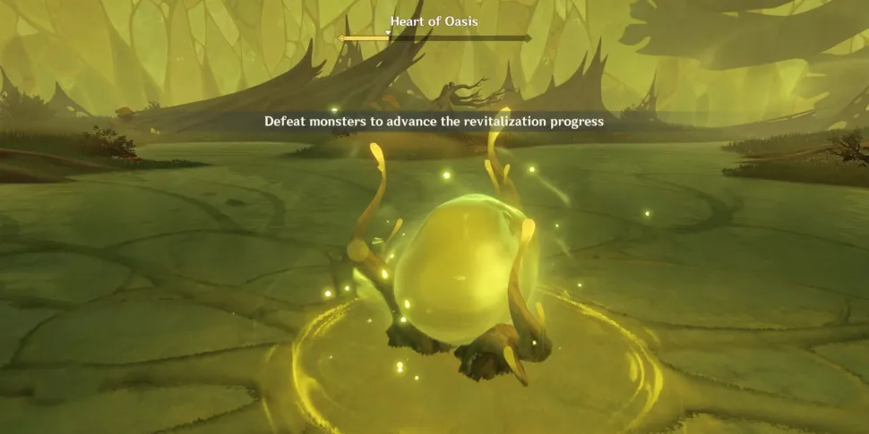 После победы над Хранителем последнего оазиса, Сердце оазиса упадет вниз, и вокруг него начнут собираться монстры. Враги будут отдавать предпочтение Сердцу и пытаться опустошить его счетчик. Игроки могут защитить счетчик, быстро побеждая волны монстров, приближающихся к Сердцу. Они также могут управлять монстрами, используя способности Анемо или вызывая Элементарные реакции, такие как Заморозка или Перегрузка.