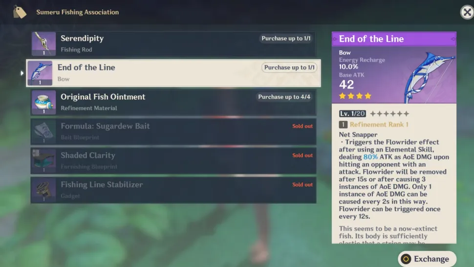 В расширении 3.0 Genshin Impact игроки попали в страну Мудрости - Сумеру, а вместе с ней - в новую региональную ассоциацию рыболовов, которая предлагает множество наград для тех, кто готов потрудиться на рыбалке. Одной из наград Ассоциации рыболовов Сумеру является "End of the Line" - 4-звездочный лук. Игроки также могут получить материалы, необходимые для улучшения лука до R5 - максимального уровня. Разблокировка этого оружия и всех материалов для его усовершенствования будет эквивалентна тому, что если бы оружие находилось в гаче, то его можно было бы достать 5 раз.