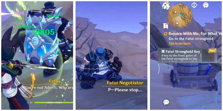 - Победите Фатуи и получите ключ от крепости Фатуи.