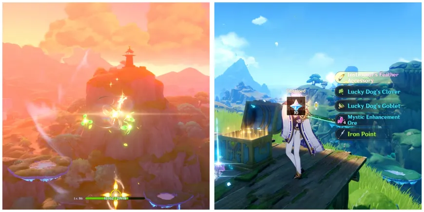 После убийства цветка Пиро-Вопперфлауэр появится длинный ряд четырехлистников, соединяющих две горы. Используйте их, чтобы добраться до башни вдалеке и забрать роскошный сундук в Genshin Impact. В награду вы получите:
