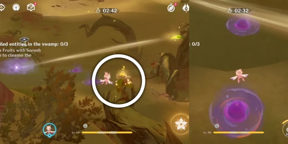 После пробуждения силы Хварены, игроки Genshin Impact должны собрать плоды Ниродха, чтобы очистить осквернение. Для этого с помощью Соруш подойдите к светящемуся цветку возле колючей ветки и используйте ее Умение. Это вызовет появление восьми зарядов плодов Ниродха, которые можно бросить с помощью кнопки Elemental Burst.