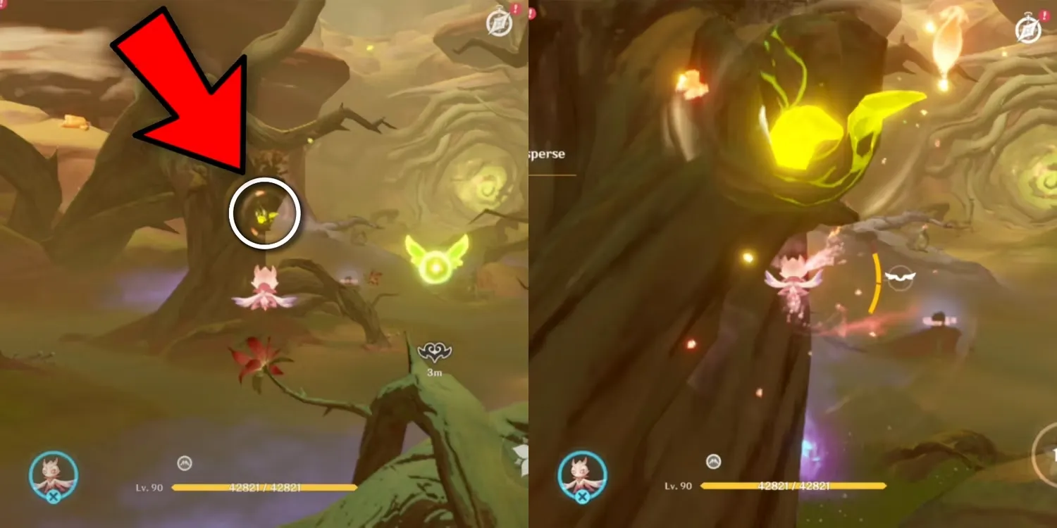 После пробуждения силы Хварены, игроки Genshin Impact должны собрать плоды Ниродха, чтобы очистить осквернение. Для этого с помощью Соруш подойдите к светящемуся цветку возле колючей ветки и используйте ее Умение. Это вызовет появление восьми зарядов плодов Ниродха, которые можно бросить с помощью кнопки Elemental Burst.