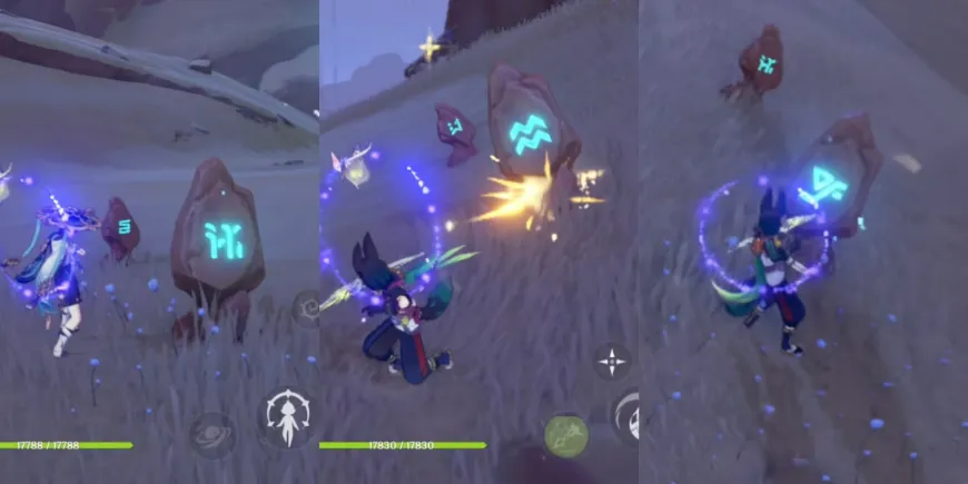 В первой головоломке в Genshin Impact есть три обветренных обелиска, за которыми должны следовать символы. Однако Seelie будет кружить вокруг камней, и каждый раз, проходя мимо камня, Seelie будет менять символ на случайный, но никогда на правильный. Это означает, что игроки могут решить эту головоломку, только опередив Seelie и сделав все камни с правильным символом до того, как он снова перепутается.