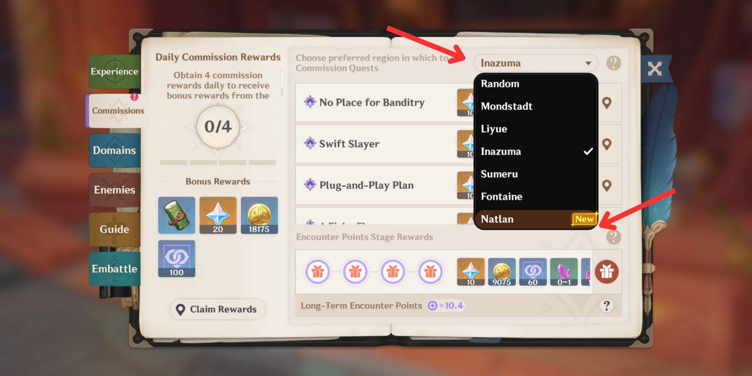 Если для ежедневных комиссий игроков установлено значение «Случайно», просто зайдите в «Справочник приключений» и измените регион. Это значок книги в правом верхнем углу экрана. Перейдите на вторую вкладку под названием «Комиссионные» и нажмите на панель в правом верхнем углу. Выберите регион «Натлан», после чего вам нужно будет дождаться перезагрузки дня, чтобы получать комиссионные с этого региона.