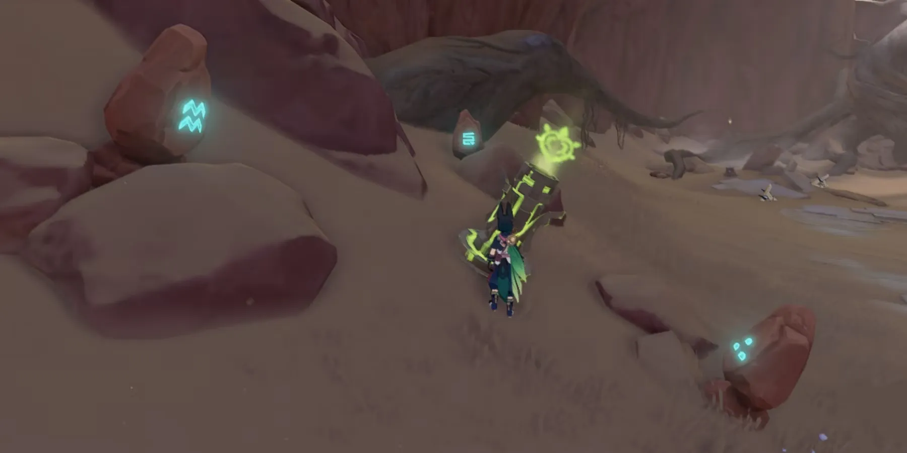 Для первого монумента Дендро игроки должны ударить по выветрившемуся обелиску (the stones), пока на нем не появятся символы, аналогичные тем, что показаны на рисунке. Согласно Священным печатям, эти три символа следующие: