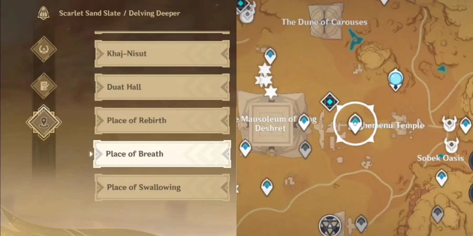 Чтобы попасть в Зал Сехем в Genshin Impact, используйте Алую песочную плиту и выберите Place of Breath. Следуйте по маркеру, пока на экране не появится текст Зал Сехем.