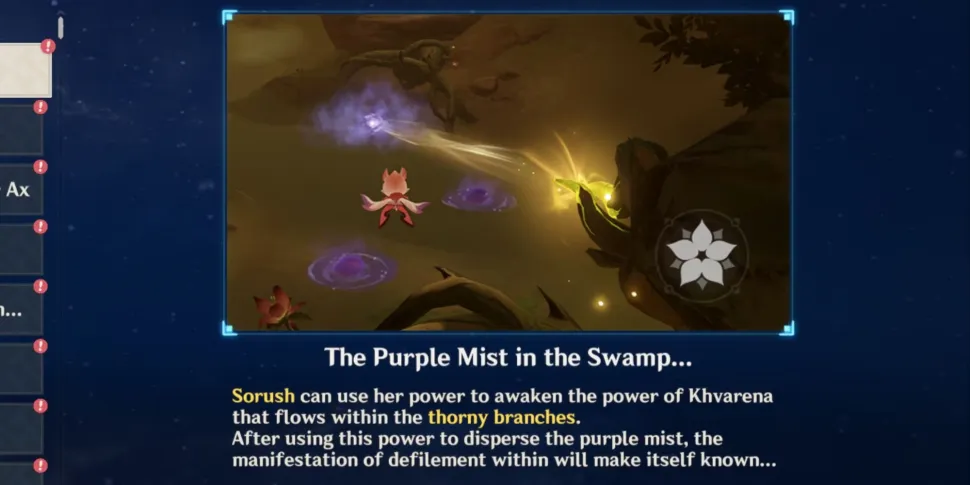 Для этого игроки должны найти и собрать плоды Ниродха и использовать способность Саруша к метанию (заменена на кнопку Elemental Burst для персонажей), чтобы уничтожить оскверненных сущностей. Эти образования похожи на сочащиеся конкременты, найденные в Бездне, и характеризуются фиолетовой жидкостью круглой формы. Чтобы успешно рассеять их, игроки должны бросать плод Ниродха, когда сущности находятся в состоянии пузыря и не двигаются. Даже если игроки пропустят несколько бросков, они все равно смогут пройти испытание, использовав способность Саруша на плоде Ниродха один раз, так как им нужно рассеять только 2 или 3 этих сущностей, однако при желании они могут восполнить способность.