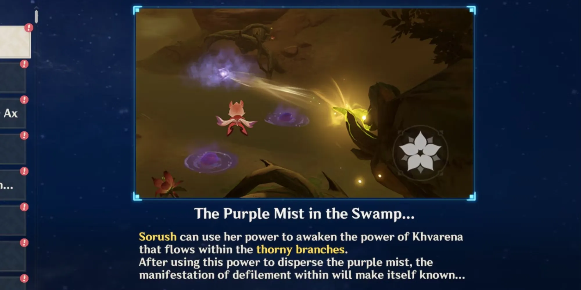Для этого игроки должны найти и собрать плоды Ниродха и использовать способность Саруша к метанию (заменена на кнопку Elemental Burst для персонажей), чтобы уничтожить оскверненных сущностей. Эти образования похожи на сочащиеся конкременты, найденные в Бездне, и характеризуются фиолетовой жидкостью круглой формы. Чтобы успешно рассеять их, игроки должны бросать плод Ниродха, когда сущности находятся в состоянии пузыря и не двигаются. Даже если игроки пропустят несколько бросков, они все равно смогут пройти испытание, использовав способность Саруша на плоде Ниродха один раз, так как им нужно рассеять только 2 или 3 этих сущностей, однако при желании они могут восполнить способность.