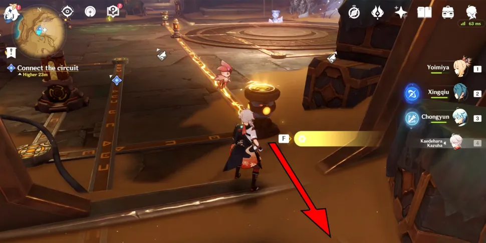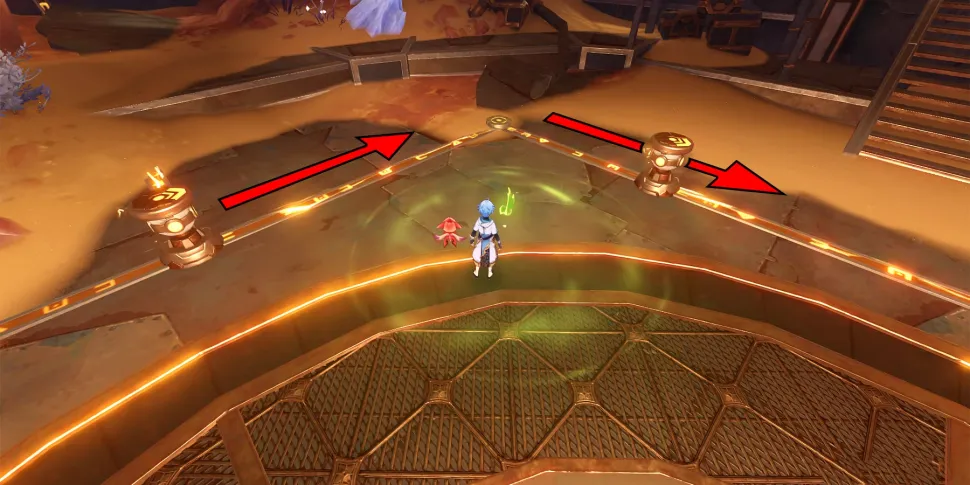 Как только игроки войдут в комнату, Паймон укажет, откуда исходит энергия, указывая, что она идет сверху. Оттуда Путешественник должен начать соединять цепи. Но сначала некоторые системы управления энергией заражены Серыми кристаллами, и игрокам придется следовать за двумя Сили, чтобы получить два Фаррвика.