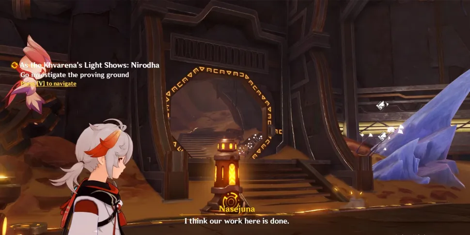 Когда игроки подойдут к двери с левой стороны, чтобы исследовать ее во время квеста As The Khvarena's Light Shows: Nirodha World Quest в Genshin Impact, они заметят большую комнату с множеством систем управления энергией. Из этой комнаты Путешественник и Наседжуна должны соединить Цепь, чтобы продолжить выполнение Мирового квеста.
