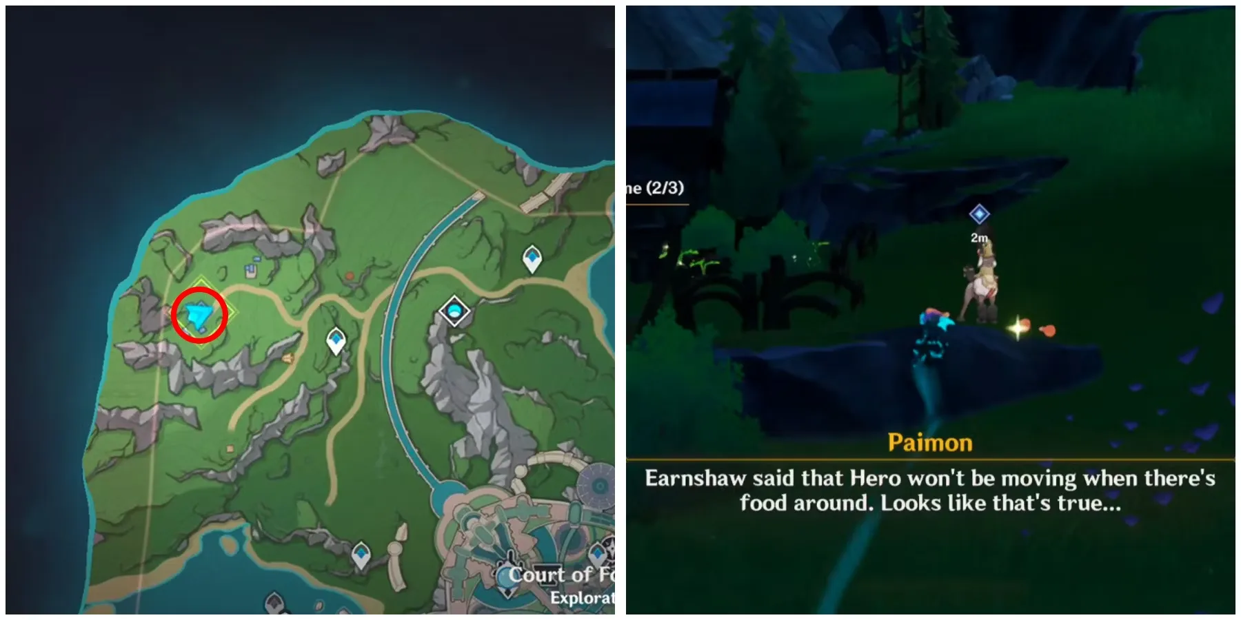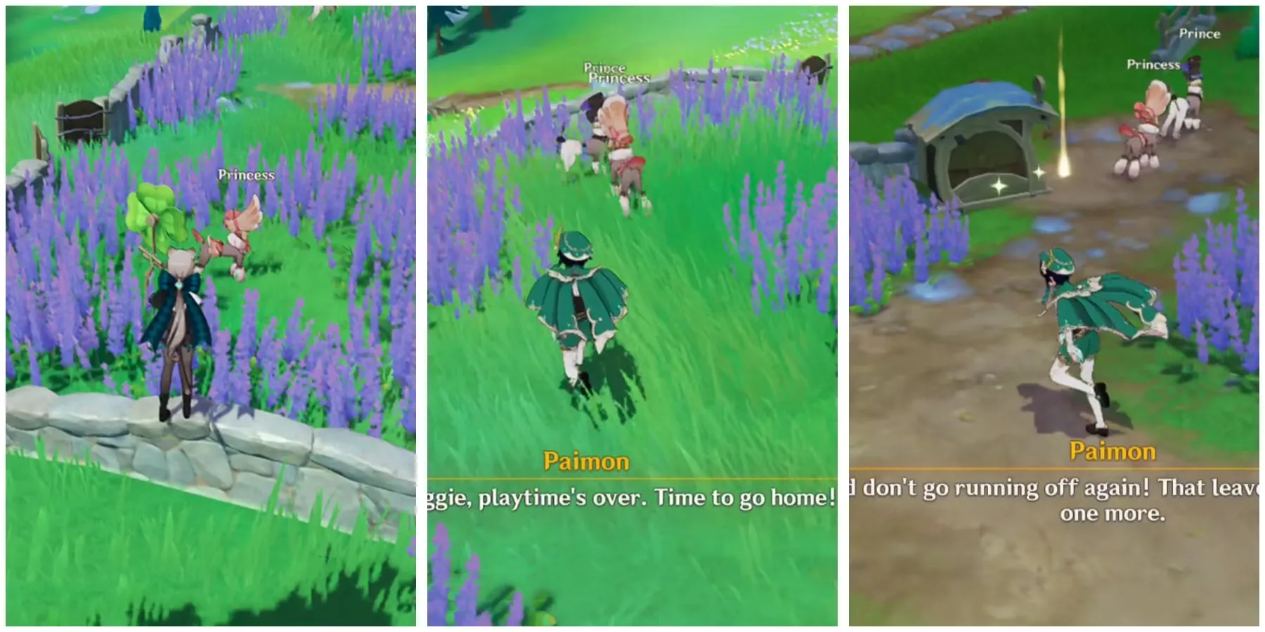 После того как принц и принцесса вернутся домой, игроки должны найти Героя в другом месте. Следуйте по квестовой метке Genshin Impact к западному краю области, затем соберите всю подозрительную птицу. Когда вся еда будет собрана, верните собаку в дом тем же способом, что и принца с принцессой, - просто идите за собакой и ведите ее домой.