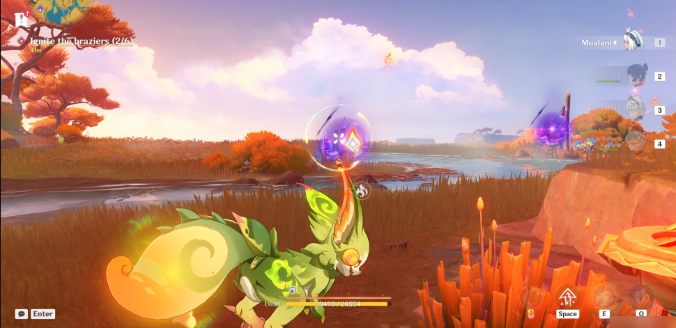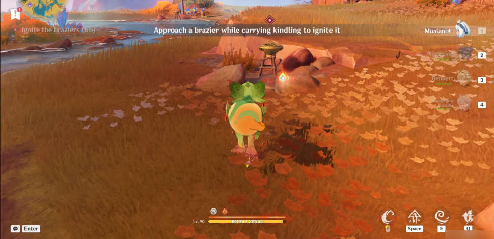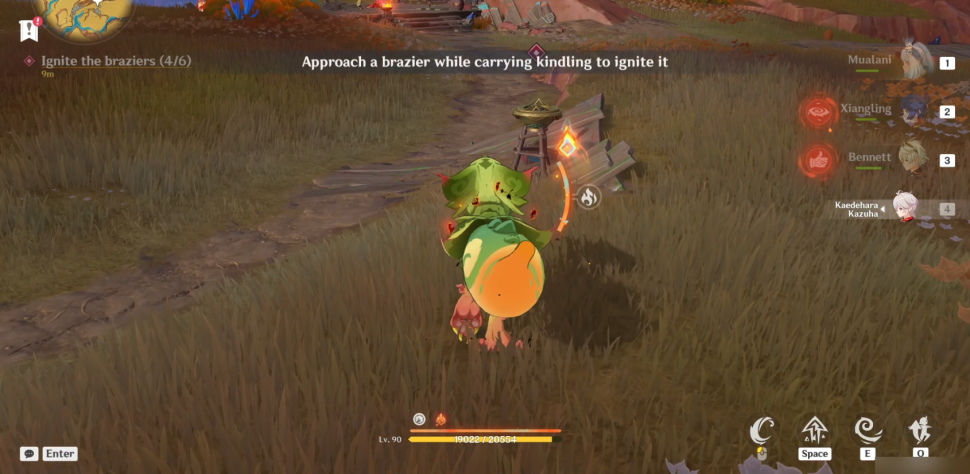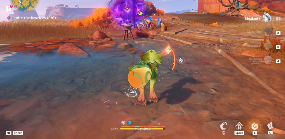 Далее повернитесь на север и подберите гранат, используя навык Юмкасавра (нажмите E). Как только вы получите его, бросьте его в сторону Бездны (светящаяся фиолетовая зловещая аура). Вы можете бросить его более точно, удерживая E, чтобы прицелиться, куда бросать пламегас. Это уничтожит скверну и подожжет мангал (1/6).