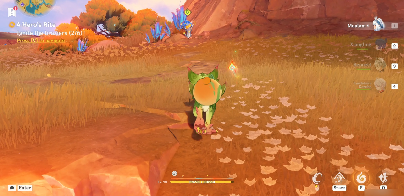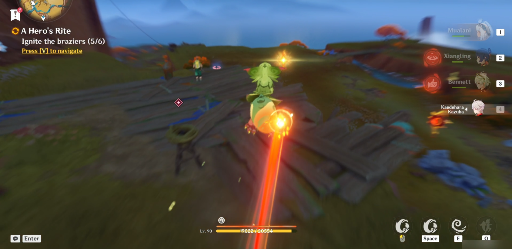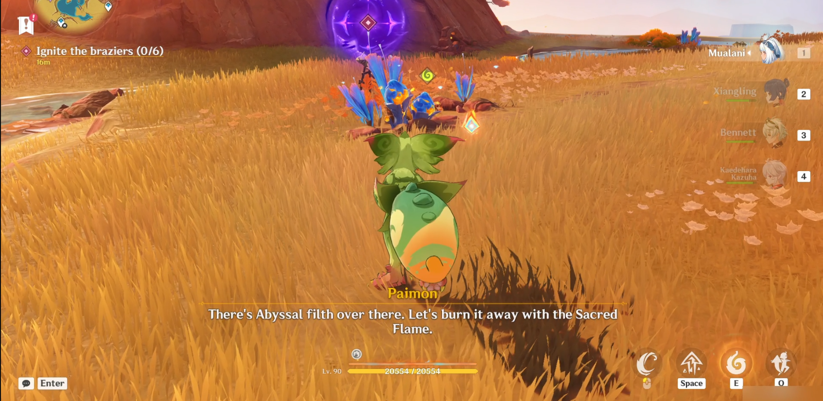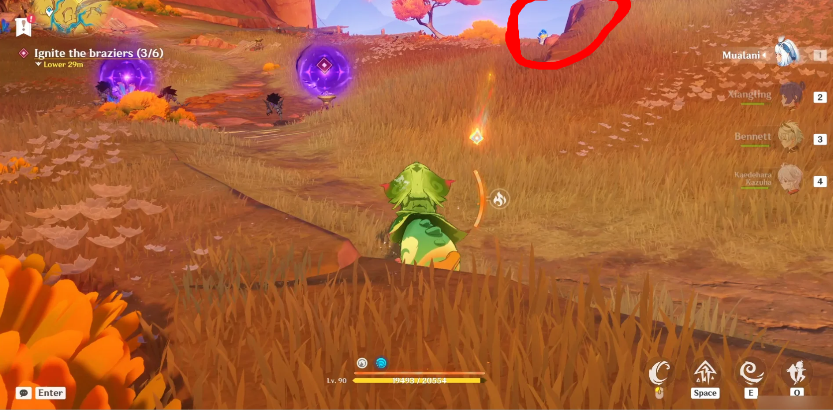 Далее повернитесь на север и подберите гранат, используя навык Юмкасавра (нажмите E). Как только вы получите его, бросьте его в сторону Бездны (светящаяся фиолетовая зловещая аура). Вы можете бросить его более точно, удерживая E, чтобы прицелиться, куда бросать пламегас. Это уничтожит скверну и подожжет мангал (1/6).