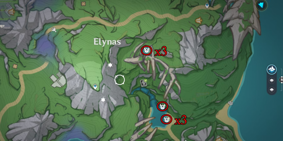 От точки маршрута Elynas спуститесь со скалы на северо-восток и возьмите три материала Genshin Impact из мелкого пруда. Затем отправляйтесь на юг к более крупному пруду, скрывающему вход в пещеру, чтобы собрать четыре Pluie Lotus.